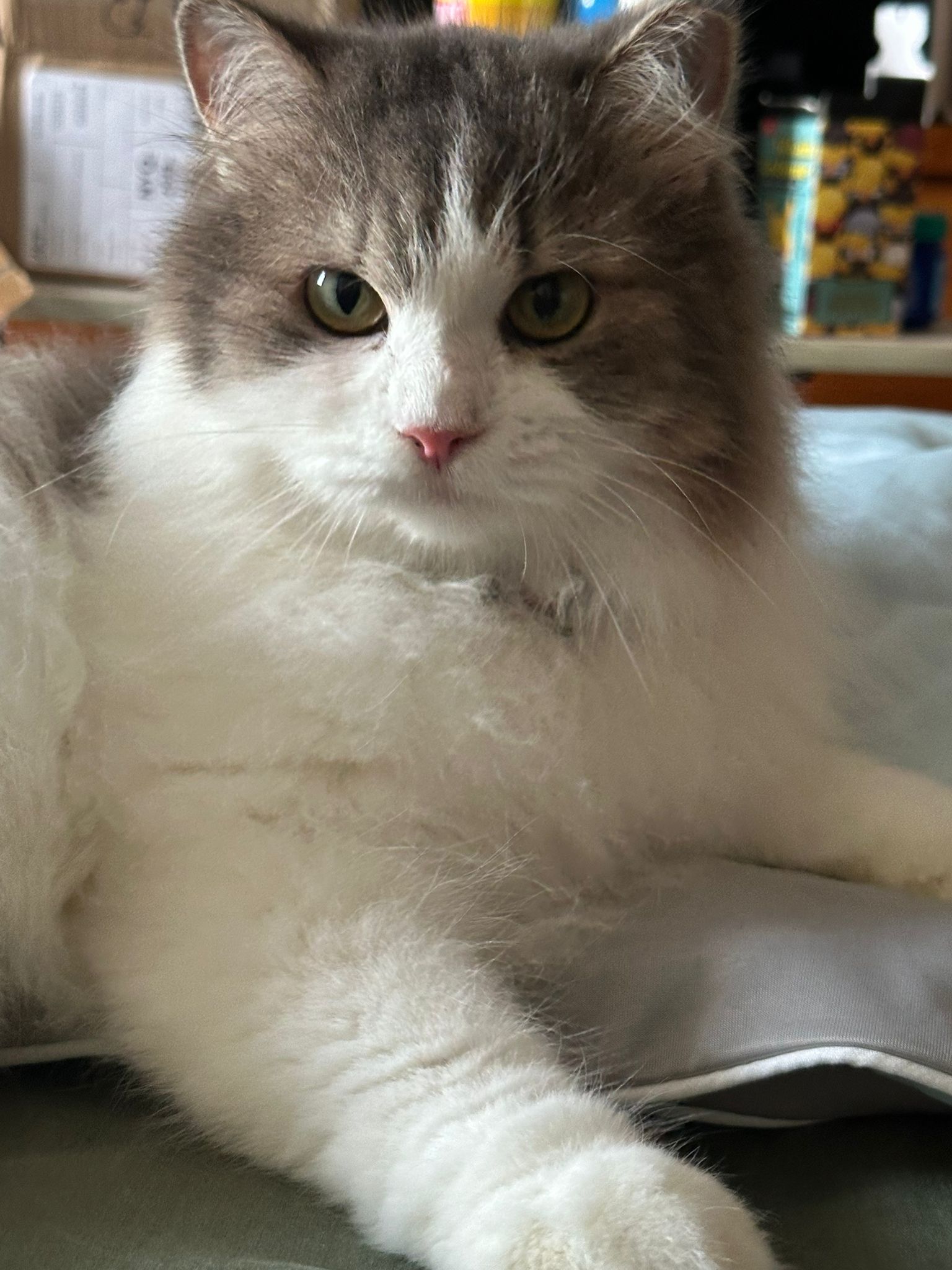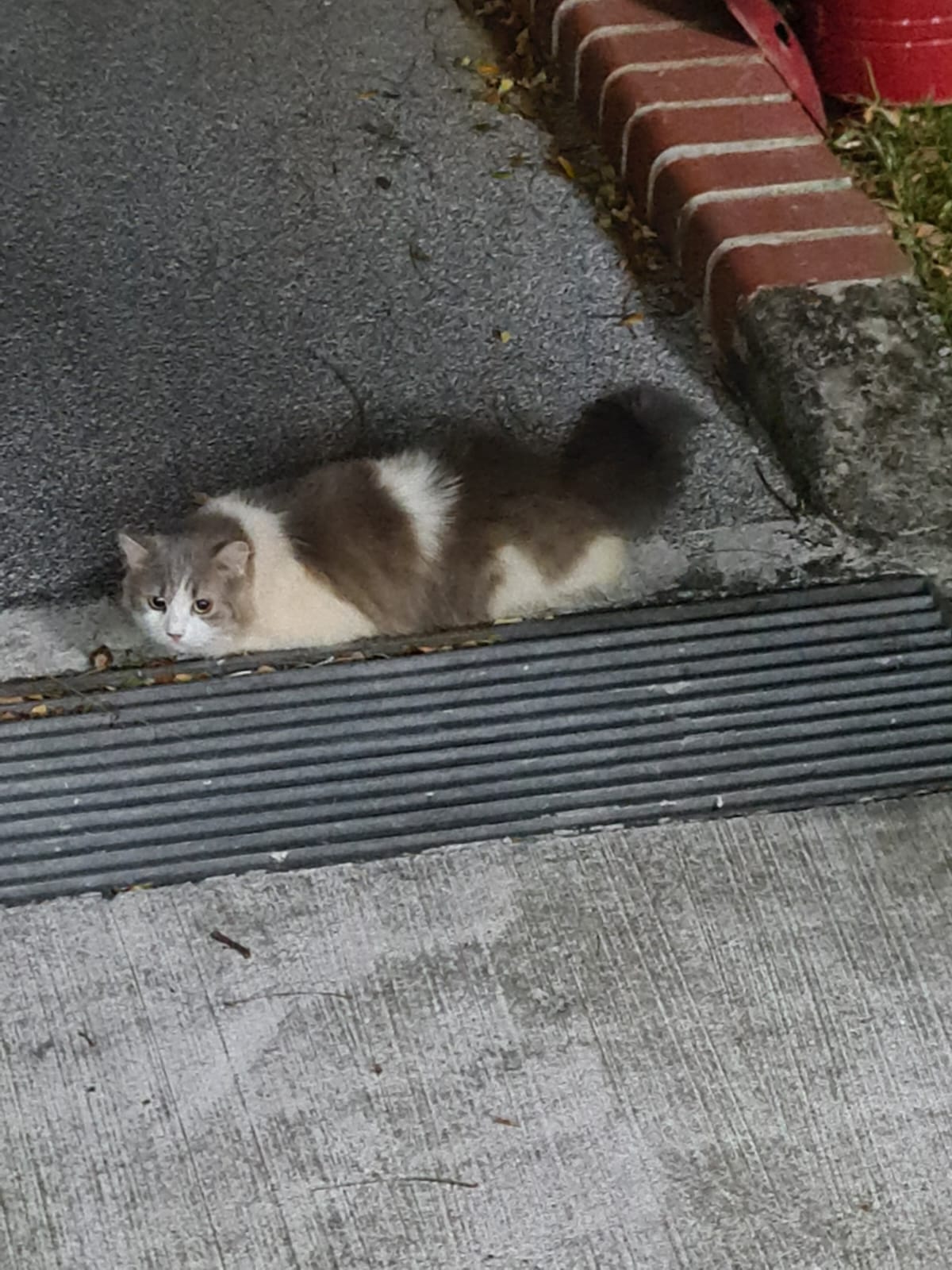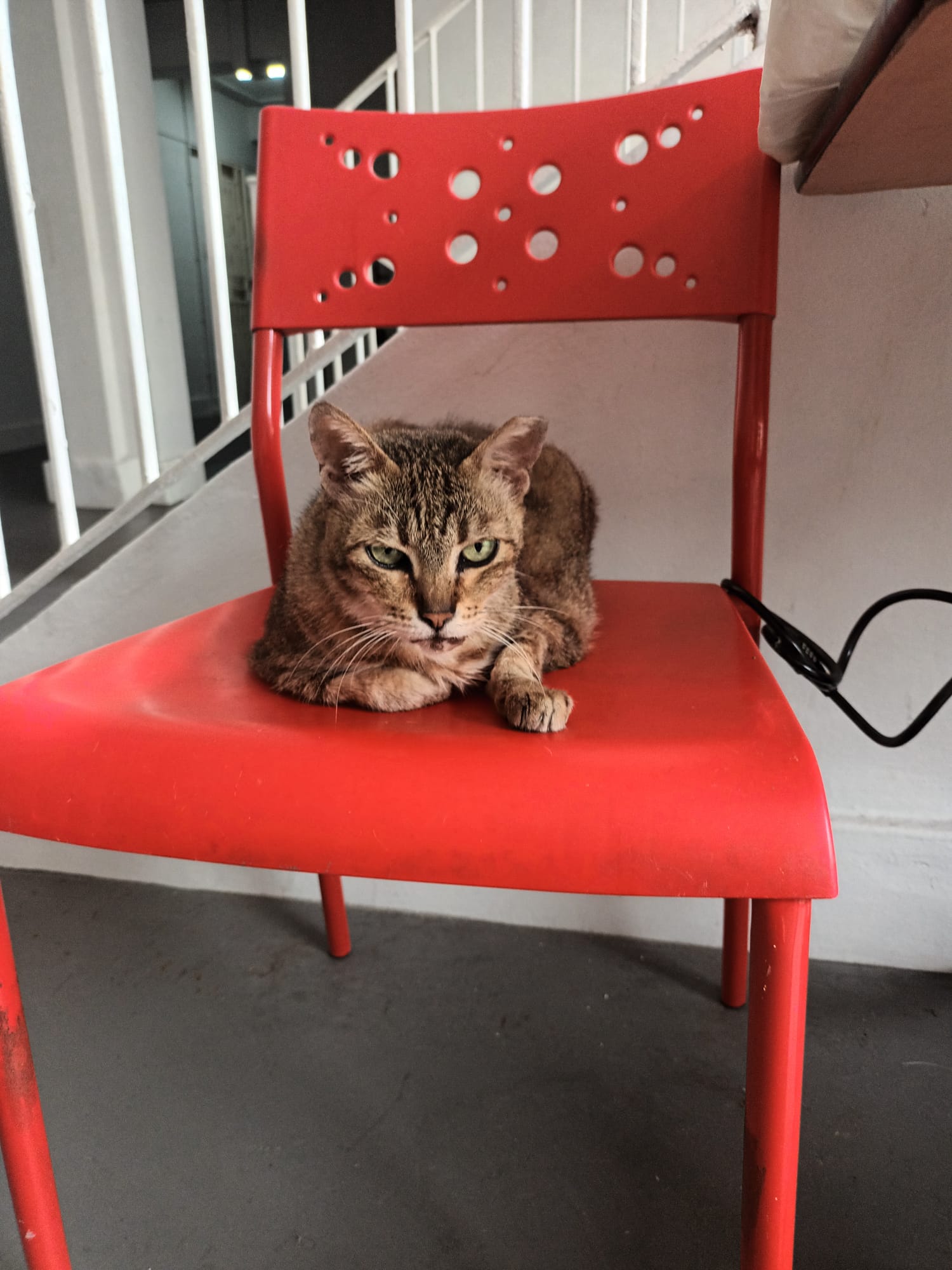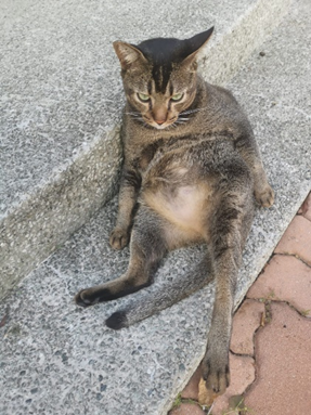 The last of 3 sisters. The owner died years ago, and family dumped them outside the flat. For years the 3 sisters lived on the doormat, not understanding why they were kicked out. Feeders cared for them, and one by one, two died. Now she lives on the lift landing where a public feeder takes care of her.