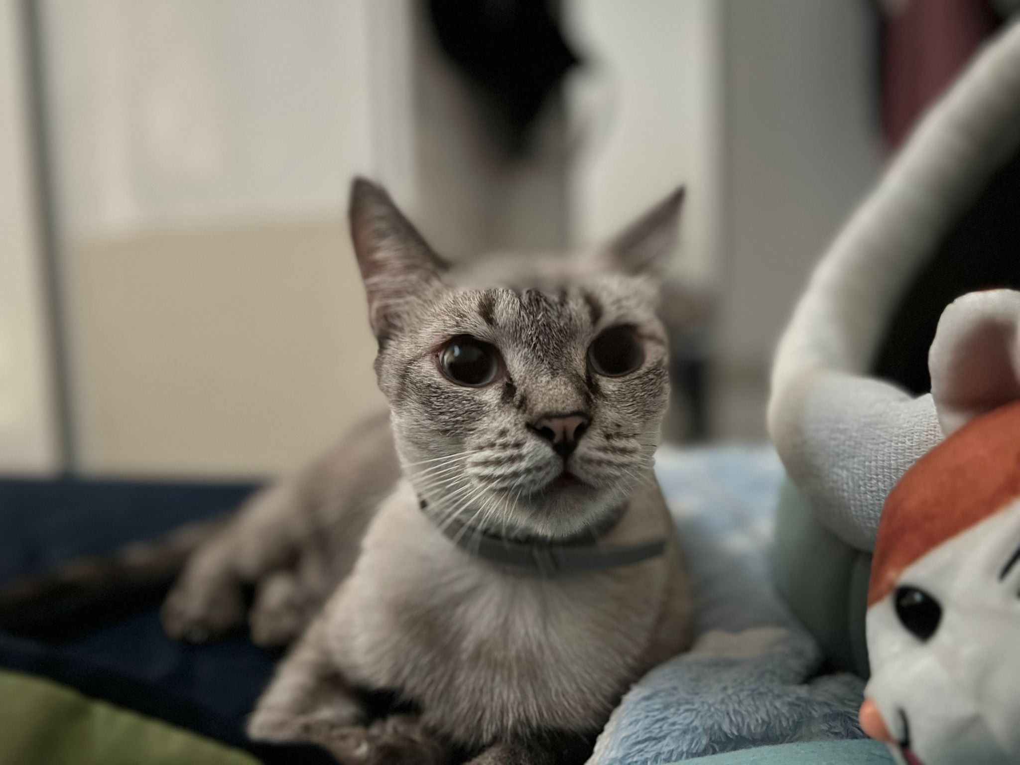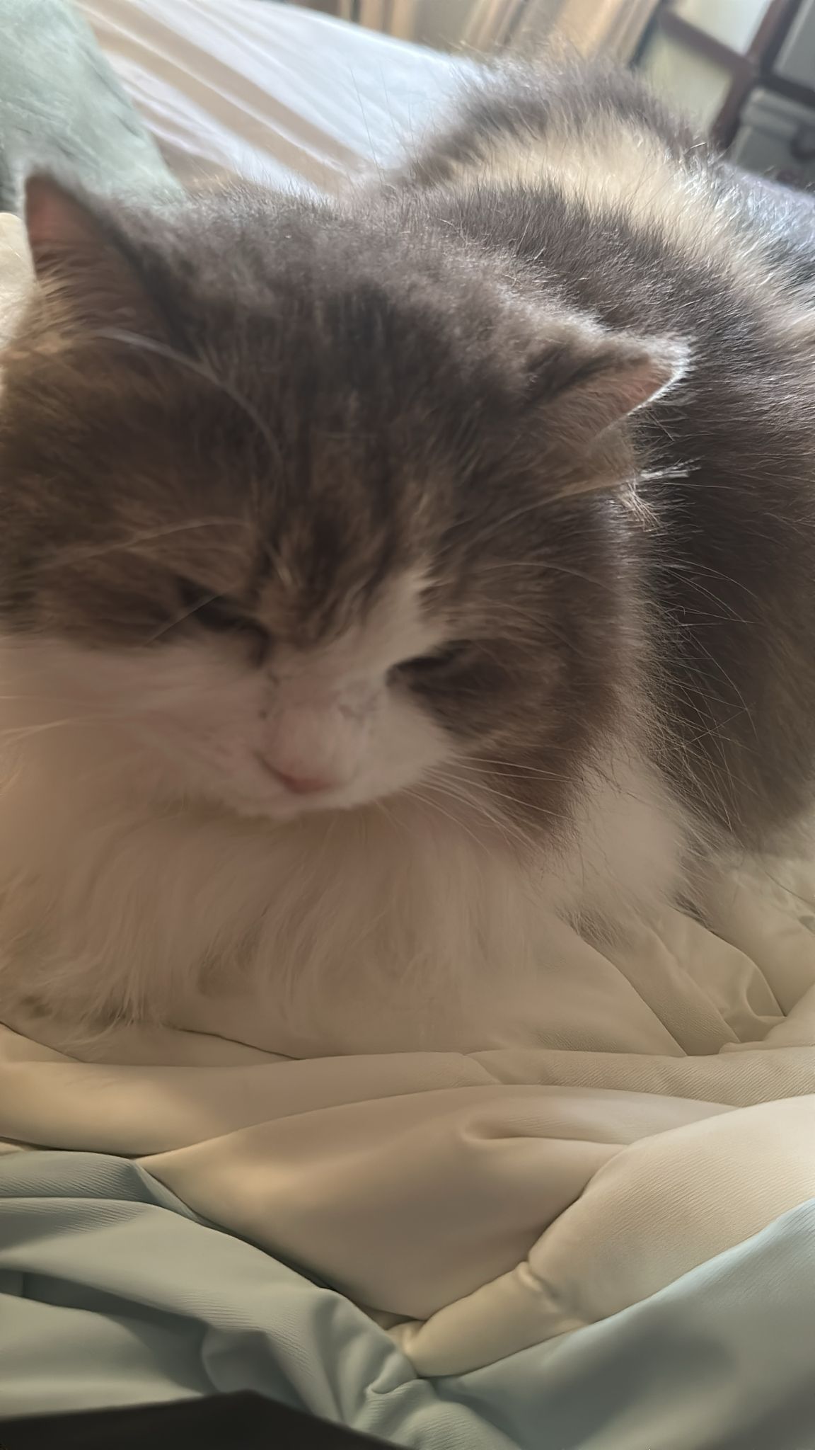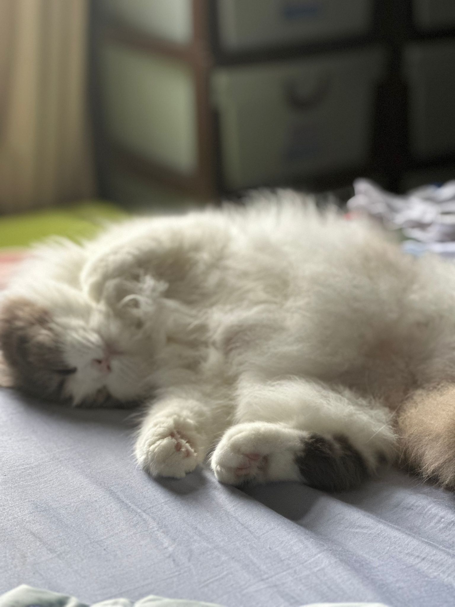 The last of 3 sisters. The owner died years ago, and family dumped them outside the flat. For years the 3 sisters lived on the doormat, not understanding why they were kicked out. Feeders cared for them, and one by one, two died. Now she lives on the lift landing where a public feeder takes care of her.